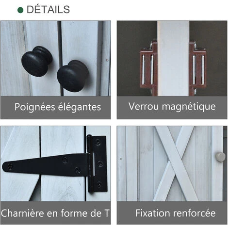 Outils et accessoires de jardin vont pouvoir être rangés sans difficulté dans cette abri de jardin équipé de 2 portes, 2 étagères et grand placard. La conception en bois de pin massif pré-huilé et peint en gris contribue à la solidité de cet abri de jardin tout en apportant une touche d’esthétisme. Le toit bitumé en pente facilite l’écoulement de l’eau et de la neige. Caractéristiques : – Armoire de jardin en pin massif robuste, idéale pour ranger et protéger vos outils et accessoires de jardin – Toit incliné et bitumé assurant une parfaite étanchéité et une résistance accrue aux intempéries – Equipée de 2 étagères à 3 niveaux (côté gauche) et d’1 grand espace de rangement (côté droite) – Protection du bois par l’application d’une lasure naturelle résistante aux UV et à l’humidité – Armoire munie de 4 pieds robustes pour la protection contre l’humidité du sol – 2 portes faciles à ouvrir et à fermer grâce à leurs poignées – Conçue aussi bien pour l’extérieur que l’intérieur – Finition de qualité : charnières en T solides, locqueteaux magnétiques assurant la fermeture impeccable de vos portes, portes avec croisillons – Installation facile grâce au manuel de montage illustré fourni Spécifications : – Couleur : gris – Matériaux principaux : bois massif de sapin pré-huilé et peint – Dim. totales : 110L x 55I x 117H cm – Dim. armoire : 91L x 46,5I cm – Dim. chaque porte : 46L x 100H cm – Dim. étagère : 46,4L x 40,5l x 32,4H cm – Dim. placard : 46,4L x 40,5l x 106,4H cm – Surface au sol : environ 0.45 m² – Hauteur pieds : 5 cm – Charge max. recommandée : 15 Kg (par étagère), 50 Kg (au total) – Livraison effectuée en un colis – Réf. : 845-324