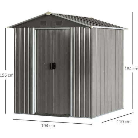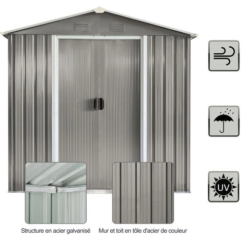 Cet abri de jardin 2 portes en tôle d’acier vous sera d’une grande utilité. Disposant d’une surface de rangement de 2,13 m², vous pourrez y ranger vos outils et équipements de jardin (pelle, pioche, rateau, sécateur, tondeuse, transat, équipement de piscine, etc…). Caractéristiques : – Abri de jardin cabanon en tôle d’acier ondulée gris très élégant – Grande surface de rangement de 2,13 m², adapté pour ranger vos outils et équipements de jardin (pelle, pioche, rateau, sécateur, tondeuse, transat, équipement de piscine, etc…) – Double porte (possibilité de mettre un cadenas si vous souhaitez) : acces facile, rangement sûr – Toit incliné, évacuation optimale de l’eau de pluie – Structure en tôle d’acier avec châssis acier galvanisé robuste : usage pérenne – Grilles d’aération avant et arrière : ventilation optimum – Montage facile à l’aide du manuel d’assemblage illustré fourni – Note : plancher non inclus Spécifications : – Couleur principale : gris – Matériaux principaux : tôle d’acier, acier galvanisé, polypropylène – Dim. totales : 194L x 110l x 184H cm – Dim. espace rangement interne : 184L x 98l cm – Dim. portes : 82l x 154H cm – Dim. fenêtres : 15L x 7l cm – Surface sol d’utilisation : 2,13 m² – Livraison effectuée en 2 colis – Réf. : 845-425GY