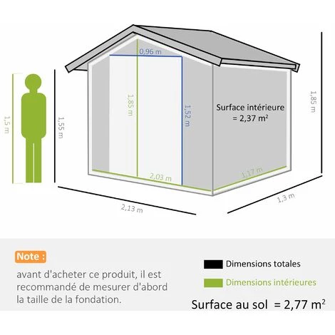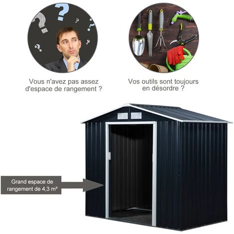 Cet abri de jardin 2 portes en tôle d’acier vous sera d’une grande utilité. Disposant d’une surface de rangement de 2,38 m², vous pourrez y ranger vos outils et équipements de jardin (pelle, pioche, rateau, sécateur, tondeuse, transat, équipement de piscine, etc…). Caractéristiques : – Abri de jardin cabanon en tôle d’acier ondulée très élégant – Grande surface de rangement de 2,38 m², adapté pour ranger vos outils et équipements de jardin (pelle, pioche, rateau, sécateur, tondeuse, transat, équipement de piscine, etc…) – Double porte (possibilité de mettre un cadenas si vous souhaitez) : acces facile, rangement sûr – Toit incliné, évacuation optimale de l’eau de pluie – Structure en tôle d’acier avec châssis acier galvanisé robuste : usage pérenne – Grilles d’aération avant et arrière : ventilation optimum – Montage facile à l’aide du manuel d’assemblage illustré fourni – Note : plancher non inclus Spécifications : – 2 coloris au choix : vert ou gris – Matériaux principaux : tôle d’acier, acier galvanisé, polypropylène – Dim. totales : 213L x 130l x 185H cm – Dim. espace rangement interne : 203L x 117l x 185H cm – Hauteur avant-toit : 155 cm – Dim. portes : 96l x 152H cm – Dim. grilles d’aération : 21,8L x 9,8l cm – Livraison effectuée en 2 colis – Réf : 845-030GN/CG