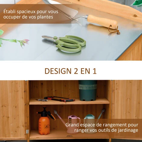 Cette superbe armoire de jardin table de rempotage 2 en 1 avec double porte, étagère et plateau en tôle d’acier galvanisé vous deviendra vite indispensable. Très pratique et offrant un espace utile de rangement conséquent, vous pourrez y ranger vos outils ou autres accessoires et rempoter vos fleurs la saison venue !