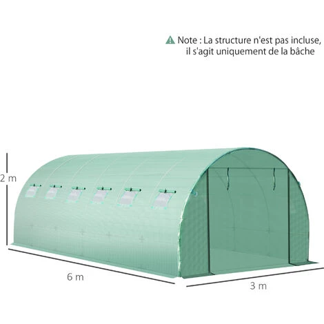 Cette bâche de rechange pour serre tunnel de jardin vous aidera à protéger vos plantes contre le froid et les oiseaux. Sa conception et fabrication avec des matériaux de qualité vous assureront un parfait rendement. Caractéristiques : – Bâche de rechange serre tunnel de jardin dim. 6L x 3l x 2H m – Surface au sol de 18 m² idéale pour tout type de plantations : fleurs, légumes, fruits, etc… – Protection assurée contre le froid, les oiseaux, le rayonnement solaire, etc… – Bâche en polyéthylène rallongée de 15 cm pour une installation optimisée au sol et pour une structure plus solide et stable – Porte enroulable zippée pour un accès facile – 12 fenêtres enroulables avec moustiquaires et cordons d’attache : luminosité & ventilation optimums sans les insectes nuisibles – Assemblage requis – Note : veuillez ne pas utiliser de pesticides pour éviter de détériorer la bâche Recommandé d’enterrer les extrémités de la bâche pour plus de rigidité de l’ensemble Spécifications : – Couleur : vert – Matériau principal : polyéthylène – Dim. totales : 6L x 3l x 2H m – Dim. porte : 2L x 1,55l m – Dim. fenêtres : 37L x 37l cm – Livraison effectuée en un colis – Réf. 845-382GN