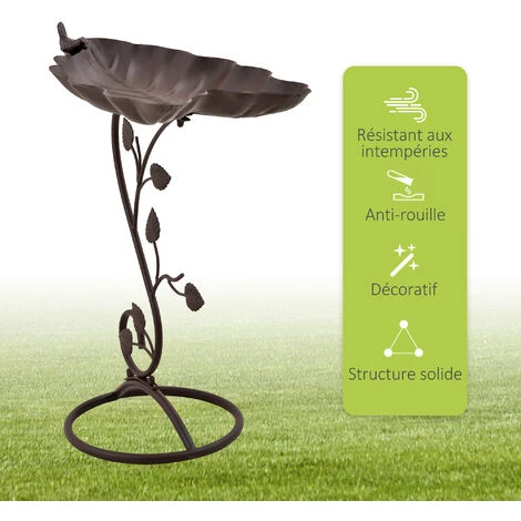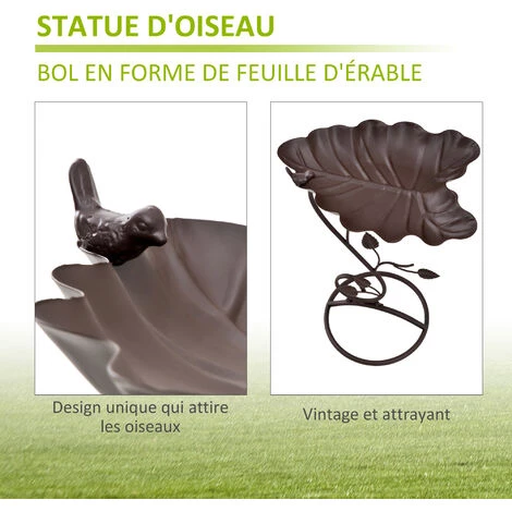 Ce splendide bain d’oiseau abreuvoir sublimera votre extérieur ! Il ajoutera du charme et du cachet à votre jardin. Tous les éléments sont réunis pour que cet abreuvoir devienne le lieu de rendez-vous incontournables des oiseaux tout au long de l’année. Caractéristiques : – Bain d’oiseau abreuvoir mélant originalité et élégance – Pièce de décoration extérieure imitation bronze antique qui ajoutera un charme rustique et champêtre très tendance à votre jardin – Design original : abreuvoir en forme de feuille d’érable avec petit oiseau – Conçu et fabriqué en métal époxy robuste résistant aux intempéries, rayons UV : usage pérenne – Stabilité optimale grâce à son large piètement central – Assemblage facile (manuel illustré fourni) Spécifications : – Couleur : bronze antique – Matériau principal : métal époxy – Dim. totales : 38,5L x 31l x 54H cm – Diamètre du socle : 25 cm – Poids net : environ 1 Kg – Livraison effectuée en un colis – Réf : 844-276