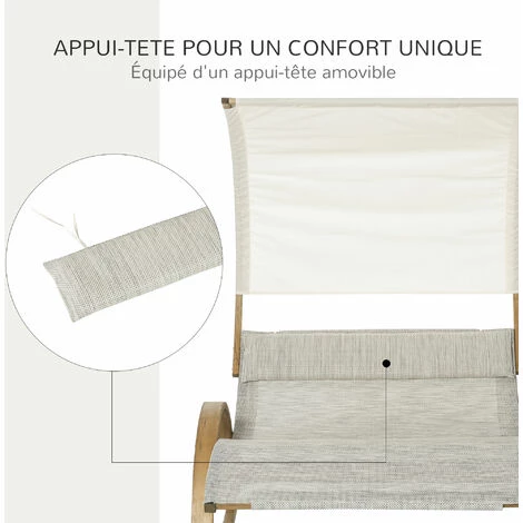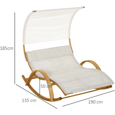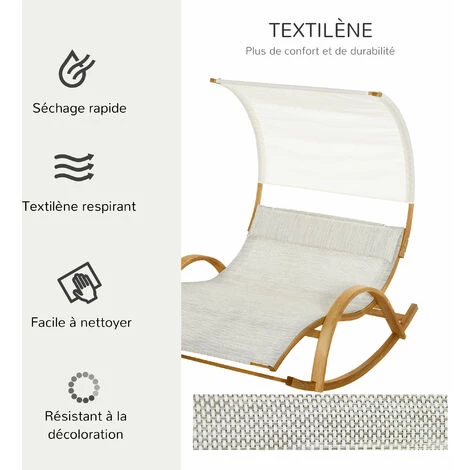 Ce bain de soleil à bascule 2 personnes design contemporain avec pare-soleil et tétière incluse vous permettra de profiter au mieux des beaux-jours. De quoi se prélasser et se bercer au soleil ou à l’ombre en toute quiétude ! Caractéristiques : – Bain de soleil lit de jardin à bascule 2 places design contemporain aux lignes arrondies harmonieuses – Lit double grand confort équipé d’une grande tétière amovible, d’accoudoirs et d’un toit pare-soleil de quoi se prélasser et se bercer au soleil ou à l’ombre en toute quiétude ! – Châssis en bois massif de pin pré-huilé robuste : charge max. commandée de 180 Kg, durée de vie pérenne – Toile de toit en polyester haute densité 180 g/m² amovible, anti-UV, imperméable – Revêtement lit en textilène imperméable, résistant à l’humidité (séchage rapide) et anti-UV – Montage rapide (manuel d’assemblage illustré) et entretien facile Spécifications : – Couleurs : bois de pin pré-hulé (châssis), crème chiné (couchage), crème (pare-soleil) – Matériaux principaux : bois massif de pin pré-huilé, textilène, polyester haute densité – Dim. totales : 190L x 135l x 185H cm – Dim. du toit : 174l x 120H cm – Dim. surface couchage : 174l x 135P x 50H cm – Dim. tétière : 115L x 25l x 6H cm – Charge max. recommandée : 180 Kg – Livraison effectuée en un seul colis – Réf. : 84B-543