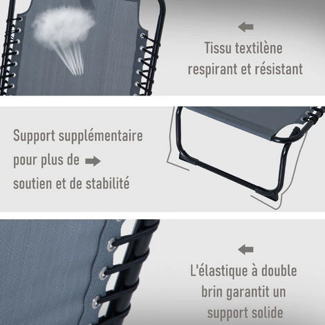 Ce joli bain de soleil grand confort vous permettra de profiter pleinement du soleil dans votre jardin, sur votre terrasse ou au bord de votre piscine ! Pliable, doté d’un dossier inclinable multi-positions et d’une surface en textilène avec lacets élastiques, vous ne pourrez pas résister à une petite sieste confortablement installé dans votre nouveau transat ! Caractéristiques : – Bain de soleil transat style contemporain avec laçage élastique très élégant – Convient autant à un usage extérieur (jardin, piscine, camping, plage) comme intérieur (véranda, patio) – Dossier réglable multi-positions, 4 positions au choix suivant votre besoin : lecture, sieste, bain de soleil, etc. – Pliable, facile à ranger et à transporter si utilisation à la plage, au camping, etc. – Châssis tubulaire en acier thermoplastique anticorrosion robuste pour un usage pérenne – Revêtement en textilène grand confort haute densité : matière résistante aux UV, à l’humidité idéale pour un usage en bord de plage ou de piscine – Piètement antidérapant : stabilité optimale, aucun risque de rayure de votre sol – Recommandation : veuillez protéger ce bain de soleil si inutilisation afin d’optimiser sa longévité Spécifications : – Matériaux principaux : acier thermoplastique, textilène haute densité, PVC – 3 coloris au choix : rouge, crème, gris – Dim. totales : 197L x 58l x 76H cm – Dim. pliées : 74L x 14l x 60H cm – Hauteur assise : 26 cm – Hauteur réglable dossier : 29/45/60/76 cm – Charge max. recommandée : 120 Kg – Livraison effectuée en un colis – Réf. : 84B-206WR/CW/GY