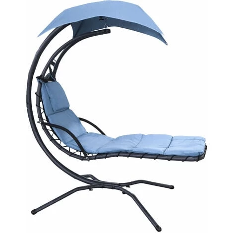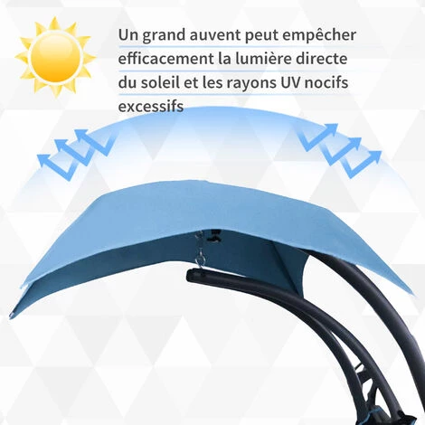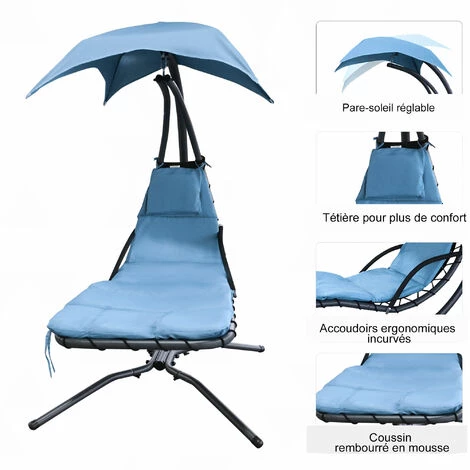 Ce magnifique bain de soleil transat suspendu design contemporain s’intègrera parfaitement dans votre jardin ou sur votre terrasse. Son design mêlant élégance, sobriété et modernité sera un atout charme et repos supplémentaire de votre extérieur ! Caractéristiques : – Bain de soleil transat suspendu complet livré avec support sur pied, matelas et même pare-soleil amovible – Pare-soleil en forme de parapluie mélant élégance et originalité – Matelas et têtière rembourrage mousse moyenne densité grand confort avec revêtement polyester 180 g/m² – Matelas et pare-soleil assortis coloris bleu – Sommier textilène ficelé par élastique : souplesse pour votre confort optimal d’utilisation – Châssis tubulaire robuste en acier époxy anticorrosion et chaine, ressort de suspension en acier galvanisé : sécurité et confort d’utilisation optimums pour un usage pérenne – Piétement 4 pieds avec patins antidérapants : stabilité et sécurité à toute épreuve – Accoudoirs avec revêtement mousse : position assise ou allongée très agréable Spécifications : – Matériaux principaux : acier époxy anticorrosion, acier galvanisé, polyester, mousse de rembourrage – Couleurs principales : bleu, noir – Dimensions totales : 1,92L x 1,13l x 2H m – Hauteur d’assise : 55 cm – Charge maximale recommandée : 120 Kg – Livraison effectuée en un seul colis – Réf. : 84A-088