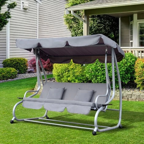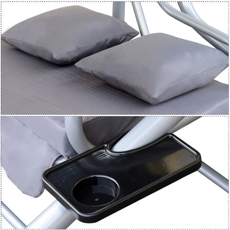 Cette magnifique balancelle convertible de jardin 3 places sera idéale pour vous détendre et faire un break au soleil ou à l’ombre. Equipée d’un toit en toile avec inclinaison réglable, de 2 tablettes support avec porte-gobelets, d’une grande banquette, etc… Vous pourrez tranquillement et confortablement lire un livre, discuter ou boire un verre ! Le meilleur atout repos et détente pour votre jardin, terrasse ou balcon. Caractéristiques : – 3 places disponibles : spacieux et confortable pour s’asseoir ou s’allonger au choix ! – Châssis en métal époxy anticorrosion : usage possible à long terme en toute sécurité – Dossier ergonomique légèrement penché : confort d’utilisation optimal d’autant plus que vous pouvez passer du mode banquette au mode lit très facilement – Toile de toit en polyester haute densité 160 g/m². Inclinaison réglable afin de vous adapter aux différentes hauteurs du soleil suivant l’heure de la journée – Toiles de toit et d’assise haut de gamme très élégantes avec extrémités en lambrequin à vagues – 2 tablettes latérales supports avec porte-gobelets – 2 coussins moelleux pour optimiser votre confort et ajouter une touche cosy – Grand matelas d’assise et de dossier confortable grâce à son rembourrage souple de 6 cm d’épaisseur et à ses attaches velcro – 4 pieds antidérapants : stabilité, sécurité optimale en mouvement – Montage et entretien facile Spécifications : – Matériaux principaux : métal époxy anticorrosion, polyester, mousse de rembourrage – Couleurs principales : crème, noir – Dim. totales : 2L x 1,2l x 1,64H m – Dim. assise : 1,60L x 0,50l x 0,46H cm – Dim. lit : 1,60L x 0,98l m – Accessoires déco. fournis : 2 coussins (dim. 40L x 40l cm) – Epaisseur rembourrage matelas : 6 cm – Charge max. recommandée : 340 Kg – Livraison effectuée en 2 colis – Réf. : 84A-051CW