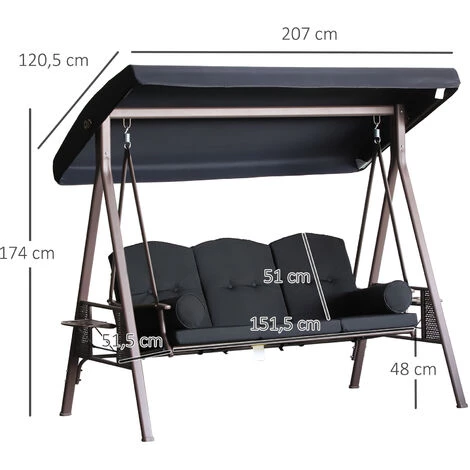 Cette magnifique balancelle de jardin 3 places grand confort sera parfaite pour vous détendre et faire un break au soleil ou à l’ombre. Disposant d’une banquette ergonomique avec coussins d’assise/dossier, accoudoirs et équipé d’un toit à inclinaison réglable, vous pourrez tranquillement et confortablement lire un livre, boire un verre et discuter en famille ou entre amis. Le meilleur atout repos et détente pour votre jardin, terrasse ou balcon ! Caractéristiques : – Design néo-rétro mêlant simplicité et élégance pour une parfaite intégration dans votre jardin ou sur votre terrasse – Capacité d’assise de 3 personnes – Dossier ergonomique légèrement incliné : confort d’utilisation optimal – Toile de toit en polyester filé haute densité 220 g/m² (inclinaison réglable afin de vous adapter aux différentes hauteurs du soleil suivant l’heure de la journée) – Grand coussin d’assise et de dossier confortable grâce à son rembourrage souple de 8 cm d’épaisseur (2 oreillers fournis) avec cordons d’attache à l’armature – Armature et banc en métal époxy anticorrosion : sécurité optimale, usage pérenne – 4 pieds antidérapants : stabilité optimale même en mouvement – 2 plateaux porte-gobelets latéraux rétractables – Montage et entretien facile (manuel d’utilisation fourni) Spécifications : – 2 coloris au choix : noir ou marron – Matériaux principaux : métal époxy anticorrosion, tissu en polyester filé 220 g/m² – Dim. totales : 207L x 120,5l x 174H cm – Largeur assise : 151,5 cm – Profondeur assise : 51,5 cm – Largeur dossier : 151,5 cm – Hauteur dossier : 51 cm – Épaisseur du rembourrage : 8 cm – Charge max. recommandée : 360 Kg – Livraison effectuée en 2 colis – Réf. : 84A-068BK/BN