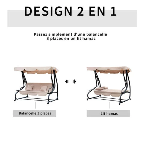 – Balancelle convertible 3 places : modèle spacieux et confortable pour s’asseoir ou s’allonger au gré de vos envies !