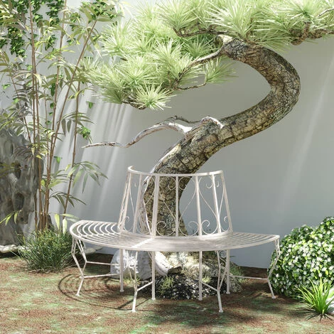 Ce magnifique banc d’arbre style fer forgé en métal blanc effet vieilli deviendra un vrai ornement de votre jardin et mettra votre arbre en valeur.