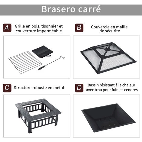 Ce magnifique braséro vous permettra de profiter d’une petite braisée lors des fraiches nuits du printemps, de l’été ou de l’automne ! Equipé d’un tisonnier, d’un couvercle pare-étincelles et même d’une housse de protection, vous pourrez en profiter en toute sécurité et praticité. Caractéristiques : – Brasero design rustique chic avec rebord imitation carrelage en pierre et piètement métal à lattes idéal pour sublimer votre extérieur – Idéal pour créer une ambiance chaleureuse et conviviale lors des nuits fraiches du printemps, de l’été ou de l’automne – Grand foyer carré de 57 cm de longueur afin de diffuser une chaleur appréciable pour vous et vos convives – Foyer métal résistant aux hautes températures jusqu’à 500? – Housse de protection incluse : protection optimale en cas d’inutilisation pour un usage pérenne – Sécurité optimale d’utilisation grâce au tisonnier et au couvercle pare-étincelles – Assemblage facile et rapide grâce au manuel de montage illustré – Recommandations d’usage : destiné uniquement à un usage extérieur hors sol en bois et à l’écart des enfants et animaux – Vivement recommandé de porter un équipement de sécurité adapté (gants, etc…) et d’éteindre le braséro après chaque utilisation – Brûler uniquement bûches de bois et charbon, conseillé d’avoir un extincteur à disposition si besoin Spécifications : – Couleur : noir – Matériaux principaux : métal, PVC – Dim. totales : 86L x 86l x 54H cm – Dim. plateau : 86L x 86l cm – Dim. brasero : 60,5L x 60,5l x 11,5H cm – Dim. couvercle : 54L x 54l x 16,5H cm – Dim. tisonnier : 49L x 6l cm – Épaisseur avant-toit : 2,3 cm – Livraison effectuée en un colis – Accessoires fournis : tisonnier + housse de protection – Réf. : 842-073