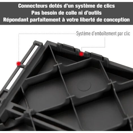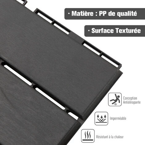 Ces caillebotis composite plastique imitation bois donneront un nouveau style à votre terrasse ou balcon en un clin d’oeil. Robustes, emboîtables, très facile à installer et ne nécessitant que très peu d’entretien, ces dalles d’extérieur vous permettront de pleinement profiter de votre extérieur en toute commodité. Caractéristiques : – Caillebotis, dalles de terrasse motifs petits carreaux idéal pour sublimer votre extérieur – Lot de 9 pièces à installer sur votre terrasse, balcon, patio, ou dans votre jardin (un lot vous permet de couvrir une surface de 0,81 m² max.) – Montage facile et rapide grâce à son système d’emboîtement (les pièces s’emboîtent les unes dans les autres en toute simplicité, aucune fixation supplémentaire n’est nécessaire) – Caillebotis en composite plastique renforcé imitation bois : grande résistance aux aléas climatiques, aux rayons-UV pour un usage pérenne – Très peu d’entretien : peu salissants, résistants à l’eau et particulièrement stables grâce à la structure en plastique renforcé – Revêtement sol antidérapant pour un confort optimal Spécifications : – Couleur : imitation bois noir – Matériaux principaux : composite plastique renforcé PP – Dimensions de chaque pièce : 30L x 30l cm (épaisseur : 2 cm) – Surface de couverture max. : 0,81 m² – Certifications norme CE – Livraison effectuée en un colis – Réf. : 844-278BK