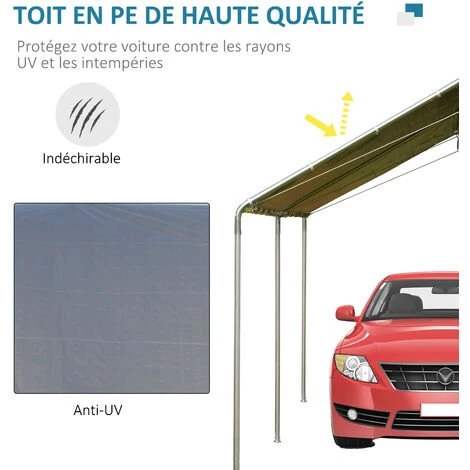 Ce superbe Carport grande taille dim. 5,95L x 2,90l x 2,60H m vous permettra de protĂ©ger efficacement votre voiture contre les intempĂ©ries (pluie, grĂȘle, gelĂ©es, neige, soleil, etc…) et les alĂ©as de l’environnement (dĂ©jections d’oiseaux, feuilles d’arbre).