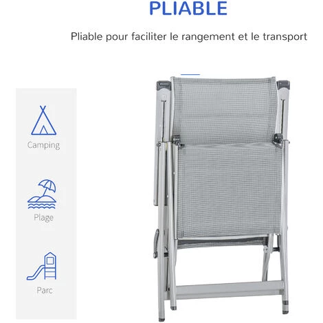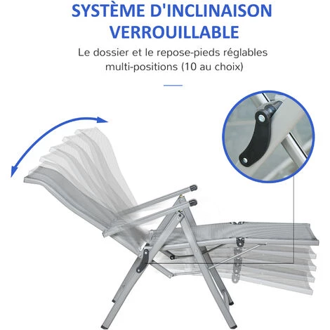 Laissez le stress de la journée s’évacuer avec cette jolie chaise longue ! Vous pourrez régler son dossier et repose-pied dans n’importe quelle position (10 au choix) pour un confort et détente inégalable. La conception pliable assure un rangement et déplacement facile. Caractéristiques : – Jolie chaise longue grise idéale pour ajouter une touche supplémentaire de modernité à votre intérieur (véranda) ou extérieur (jardin, terrasse, balcon) – Chaise longue avec accoudoirs vous permettant de prendre une position extrêmement relaxante – Structure en métal époxy anticorrosion pour un usage pérenne – Pliable et compact, facile à porter et à ranger – Dossier & repose-pied réglable multi-positions (10 au choix !) suivant votre besoin : lecture, sieste, bain de soleil, etc… – Revêtement textilène à séchage rapide et résistant aux intempéries et rayons UV du soleil – Pieds équipés de patins antidérapants : stabilité optimale, aucun risque de rayure de votre sol – Aucun montage nécessaire, utilisation & détente immédiate possible ! Spécifications : – Couleur principale : gris – Matériaux principaux : métal, textilène, PP – Dimensions position assis droit : 78L x 58l x 110H cm – Dim. position allongée : 153L x 58l x 76H cm – Dim. pliées : 100L x 17l x 58H cm – Dim. assise : 43L x 47P x 47,5H cm – Dim. dossier : 43L x 68,5H cm – Dim. repose-pied : 43L x 40P cm – Hauteur accoudoir : 66 cm – Charge max. recommandée : 120 Kg – Certifications normes EN581-1.2 – Livraison effectuée en un colis – Réf. : 84B-537