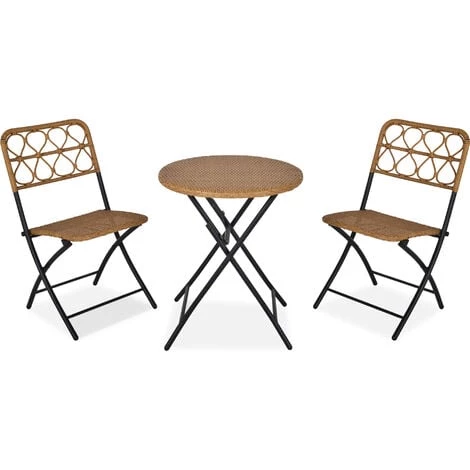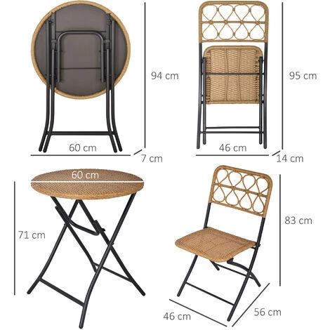 Ce magnifique ensemble de jardin bistro 2 personnes style cosy vous permettra de profiter au mieux des beaux-jours ! Sans oublier que cet ensemble 3 pièces est entièrement pliable ce qui vous facilitera son déplacement et rangement. Caractéristiques : – Ensemble de jardin bistro 2 personnes style cosy composé de 2 chaises et d’une table ronde – Salon de jardin 2 personnes qui sublimera l’espace extérieur de votre choix : balcon, terrasse, jardin, véranda, patio – Ensemble des 3 pièces pliables : déplacement facile et gain de place de rangement si inutilisation – Matériaux de qualité en acier époxy anticorrosion et résine tressée PE pour une meilleure résistance face aux rigueurs du climat : rayons UV, humidité, chaleur, etc… – Entretien facile, pratique à l’aide d’un chiffon humide et savon doux – Aucun montage nécessaire, utilisation immédiate possible ! – Recommandation : veuillez protéger cet ensemble si inutilisation afin d’optimiser sa longévité Spécifications : – Couleurs principales : beige, noir – Matériaux principaux : acier époxy anticorrosion, résine tressée PE imitation rotin – Dim. table : Ø 60 x 71H cm – Dim. chaises : 46L x 56l x 83H cm – Dim. pliées table : 94L x 60l x 7H cm – Dim. pliées chaises : 95L x 46l x 14H cm – Dim. assise : 40L x 40l x 47H cm – Dim. dossier : 45L x 46l cm – Charge max. recommandée : 110 Kg (chaise), 50 Kg (table) – Livraison effectuée en un colis – Réf : 863-054