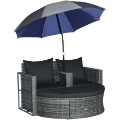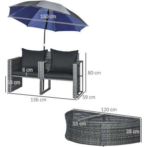Ce magnifique canapé de jardin 2 personnes Outsunny sublimera votre intérieur (véranda) ou extérieur (terrasse, balcon, jardin) grâce à son style cosy très tendance. Son grand confort et sa modularité vous permettront d’en profiter un maximum en toute circonstance, en couple, en famille ou entre amis de quoi épater tous vos convives ! Caractéristiques : – L’ensemble comprend un canapé 2 places, un repose-pieds semi-circulaire et un parasol – Résine tressée en polyéthylène imitation rotin grande résistance contre la pluie, les rayons UV du soleil, le froid, etc. et très facile d’entretien – Salon de jardin en résine avec 5 coussins rembourrés doux offrent une expérience d’assise très confortable – Ensemble salon jardin extérieur équipé d’un parasol de Ø160 cm pour offrir une protection optimale contre les rayons UV – Accoudoir central avec un trou au centre pour mettre un parasol avec un mât maximum de 40 mm de diamètre – Montage facile, rapide à l’aide du manuel d’assemblage illustré fourni Spécifications : – Couleur principale : gris – Matériaux principaux : acier, résine tressée PE, polyester, rembourrage mousse – Dim. totales : 136L x 114l x 80H cm – Dim. canapé 2 places : 136l x 55P x 54H cm – Dim. assise (avec coussin) : 54l x 55P x 34H cm – Largeur accoudoir central : 11 cm – Dim. repose-pieds : 120L x 55l x 34H cm – Diamètre parasol : 160 cm – Diamètre trou pour parasol : 40 mm – Épaisseur coussins : 6 cm – Charge maximale : 160 kg (par siège), 120 kg (repose-pieds) – Livraison effectuée en un colis – Réf. : 860-208