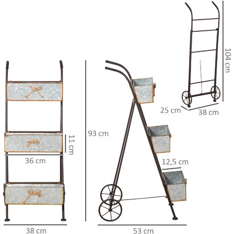 Cette jolie jardinière chariot sur pied 3 niveaux style rural chic vous permettra de faire vos plantations de légumes, plantes aromatiques ou fleurs sans avoir à trop vous baisser. Mélant originalité et élégance, compacte, pliable, elle s’intègrera parfaitement sur votre balcon, terrasse, patio ou jardin et sera facile à ranger pendant l’hiver. Caractéristiques : – Jardinière chariot escalier triple niveau idéale pour jardiner à domicile – Jardinière triple bac en métal martelé effet vieilli avec nœuds de corde idéale pour ajouter une touche d’originalité et d’élégance à votre extérieur – Triple jardinière compacte permettant de faire pousser tous types de plantations (légumes, plantes aromatiques ou fleurs) sans ajout d’insecticide – Conçue et fabriquée avec des matériaux de qualité, usage pérenne – Pliable, doté de 2 roues et 2 poignées : facile à déplacer et à ranger pendant l’hiver – Montage simple et rapide (manuel d’assemblage illustré fourni) Spécifications : – Couleurs : café, gris métal – Matériaux principaux : bois de sapin traité autoclave, geotextile – Dim. totales : 53L x 38l x 93H cm – Dim. chaque jardinière : 36L x 12,5l x 11H cm – Dim. pliées : 38L x 25l x 104H cm – Charge max. recommandée : 20 Kg – Livraison effectuée en un colis – Réf. : 845-552