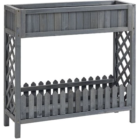 Cette magnifique jardinière sur pied en bois de sapin pré-huilé peint en gris vous permettra de faire vos plantations de légumes, plantes aromatiques ou fleurs sans avoir à vous baisser. Compacte, très élégante, dotée d’une étagère avec jolies barrières et de pans latéraux en treillis, elle s’intègrera parfaitement sur votre balcon, terrasse, patio ou jardin.