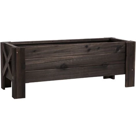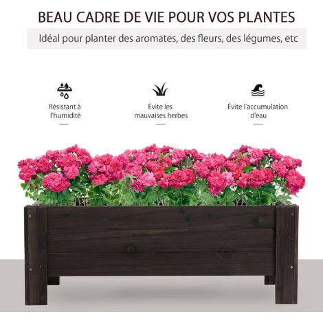 Cette superbe jardinière sur pieds en bois massif de sapin traité par carbonisation vous permettra de planter et mettre en valeur vos jolies fleurs. Compacte et très élégante, elle s’intègrera parfaitement sur votre balcon, terrasse, patio ou jardin. Caractéristiques : – Jardinière rectangulaire sur pieds idéale pour planter et mettre en valeur vos jolies fleurs – Extrémités en croix, corps longitudinal en lattes de bois massif de sapin avec veinage idéal pour ajouter une touche d’élégance à votre extérieur – Jardinière grande taille permettant de faire pousser tous types de plantations (fleurs ou plantes aromatiques) sans ajout d’insecticide – Conçu et fabriqué en bois massif de sapin traité par carbonisation : usage pérenne sans entretien – Jardinière robuste : charge max. recommandée de 80 Kg – Inserts d’irrigation inclus pour favoriser le drainage de l’eau et assurer le bon développement de vos plantes – Montage simple et rapide à l’aide du manuel d’assemblage illustré fourni Spécifications : – Couleur : bois naturel de sapin traité par carbonisation – Matériaux principaux : bois massif de sapin – Dim. totales : 100L x 36,5l x 36H cm – Dim. boîte de fleur : 91,5L x 28l x 22,5H cm – Hauteur des pieds : 10 cm – Charge max. recommandée : 80 Kg – Livraison effectuée en un colis – Réf : 845-458