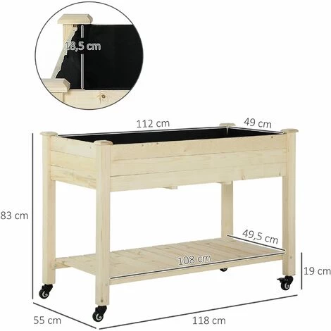Cette jolie jardinière sur pieds en bois massif de sapin vous permettra de faire vos plantations de légumes, plantes aromatiques ou fleurs sans avoir à vous baisser. Compacte et très élégante, elle s’intègrera parfaitement sur votre balcon, terrasse, patio ou jardin. Equipée d’une étagère, d’inserts d’irrigation et d’un feutre de drainage, c’est l’équipement indispensable pour tout jardinier en herbe ! Caractéristiques : – Jardinière rectangulaire potager sur pieds idéal pour jardiner à domicile sans avoir à se baisser – Jardinière en bois de sapin idéale pour ajouter une touche d’originalité et d’élégance à votre extérieur – Grande étagère qui vous permettra de ranger vos outils, sacs de terreau, graines, etc… – Carré potager grande taille permettant de faire pousser tous types de plantations (légumes, plantes aromatiques ou fleurs) sans ajout d’insecticide – 4 roulettes dont 2 équipées de frein : pratique pour déplacer facilement votre jardinière si besoin – Conçu et fabriqué en bois massif de sapin pour un usage pérenne – 4 inserts d’irrigation + feutre de drainage inclus – Montage simple et rapide à l’aide du manuel d’assemblage illustré fourni Spécifications : – Couleur : bois naturel de sapin – Matériaux principaux : bois massif de sapin, non tissé – Dim. totales : 118L x 55I x 83H cm – Dim. espace interne jardinière : 112L x 49I x 18,5H cm – Dim. étagère de rangement : 108L x 49,5I cm – Dim. inserts d’irrigation : Ø 10 mm – Charge max. recommandée : 40 Kg (jardinière) 20 Kg (étagère) – Livraison effectuée en un colis – Réf. : 845-365