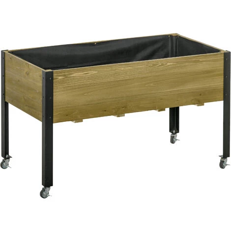 Cette jolie jardinière sur pieds avec roulettes en bois de sapin traité autoclave vous permettra de faire vos plantations de légumes, plantes aromatiques ou fleurs sans avoir à vous baisser. Compacte et très élégante, elle s’intègrera parfaitement sur votre balcon, terrasse, patio ou jardin. Equipée d’inserts d’irrigation et d’un feutre de drainage, c’est l’équipement indispensable pour tout jardinier en herbe ! Caractéristiques : – Jardinière rectangulaire potager sur pieds avec roulettes idéal pour jardiner à domicile sans avoir à se baisser – Jardinière en bois de sapin traité autoclave idéale pour ajouter une touche d’originalité et d’élégance à votre extérieur – Carré potager grande taille permettant de faire pousser tous types de plantations (légumes, plantes aromatiques ou fleurs) sans ajout d’insecticide – 4 roulettes dont 2 équipées de frein : pratique pour déplacer facilement votre jardinière si besoin – Conçue et fabriquée en bois de sapin traité autoclave avec haut piètement métal noir pour un usage pérenne – Inserts d’irrigation + feutre de drainage en geotextile noir inclus : séparation optimale du terreau et billes d’argile assurant un bon drainage et oxygénation de la terre à long terme – Montage simple et rapide à l’aide du manuel d’assemblage illustré fourni Spécifications : – Couleur : bois de sapin traité autoclave – Matériaux principaux : bois de sapin traité autoclave, geotextile – Dim. totales : 120L x 60,5l x 66H cm – Dim. espace interne jardinière : 118L x 58l x 27H cm – Charge max. recommandée : 100 Kg – Livraison effectuée en un colis – Réf. : 845-630V01