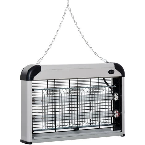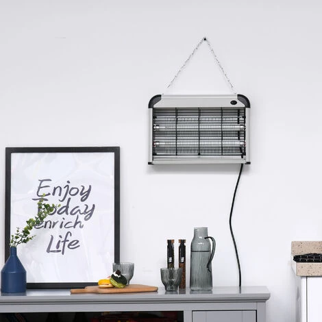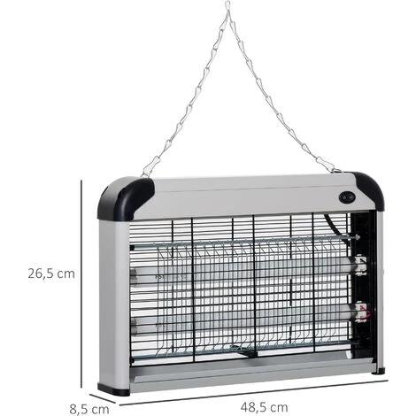 Description : Ce tueur électronique d’insectes est d’une redoutable efficacité pour débarrasser une zone de l’invasion de toutes espèces volantes : mouches, moustiques, guêpes, etc… Caractéristiques : – Lampe UV anti-insectes très rapide à installer (chaînette de suspension incluse) et d’une redoutable efficacité – Fonctionnement simple sans aucun produit chimique : les insectes volants sont attirés par la lumière bleue des tubes ultraviolets puis foudroyés par électrocution avant de tomber dans le bac récupérateur – Aucun risque de danger pour l’homme comme pour les animaux domestiques (+ aucune pollution de l’air) – Destructeur d’insectes polyvalent : peut-être installé sur une table ou suspendu sur un mur – Utilisation intérieure ou extérieure possible – Conçu et fabriqué à partir des matériaux résistants (ABS et alliage d’aluminium) pour un usagé perenne Spécifications : – Couleurs principales : noir et gris – Matériaux principaux : métal, ABS – Dim. totales : 38L x 9l x 27H cm – Dim. filet de protection : 34L x 19H cm – Dim. réseau électrique : 27L x 16H cm – Dim. tubulaire : Ø 2,6 x 34L cm – Longueur câble d’alimentation : 1,2 m – Puissance : 20 W – Tension nominale : 220 V – Durée de vie : 30 000 heures – Surface d’efficacité : env. 60 m² – Longueur chaîne : 58 cm – Certification norme CE et RoHS – Réf. : 849-011SR