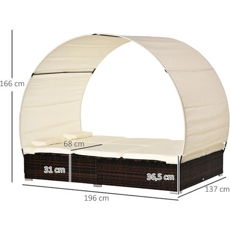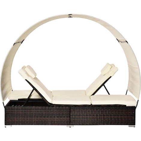 Caractéristiques : – Magnifique lit de jardin 2 places grand confort style colonial qui sublimera votre terrasse, balcon, patio, véranda, jardin et épatera vos amis ! – Lit de jardin modulable à votre guise : lit grande taille 2 places à plat, bain de soleil avec inclinaison réglable d’un côté et lit de jardin à plat de l’autre, 2 bains de soleil d’inclinaison réglable, etc… – Dossiers réglables multi-positions, 5 positions au choix suivant votre besoin : lecture, sieste, bain de soleil, etc… – Grand toit pare-soleil amovible intégré : pratique et très utile pour vous protéger du soleil, du vent léger, etc… – Résine tressée 4 fils en polyéthylène imitation rotin grande résistance contre la pluie, les rayons UV du soleil, le froid, etc… et très facile d’entretien – Matelas et tétière déperlants coloris crème fournis : confort optimal, séchage rapide – Garnissage mousse haute densité en coton 1100 g/m², revêtement polyester 180 g/m² – Structure robuste en métal époxy anticorrosion : usage pérenne en toute sécurité – Stabilité accrue grâce aux pieds individuellement réglables Spécifications : – Couleurs principales : chocolat, crème – Matériaux principaux : métal époxy anticorrosion, résine tressée en polyéthylène imitation rotin, polyester et mousse – Dim. totales : 196L x 137l x 36,5H cm (sans pare-soleil) – Hauteur max. pare-soleil : 166 cm – Dim. chaque lit : 196L x 68l cm – Hauteur assise : 31 cm (sans coussin d’assise) – Hauteur dossier : 31 / 42 / 48 / 52, 5 / 56,5 cm – Épaisseur coussin d’assise : 5,5 cm – Charge max. recommandée : 320 Kg – Livraison effectuée en 3 colis – Réf. : 862-034BN