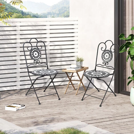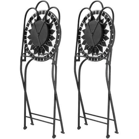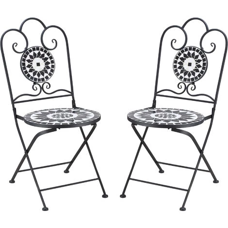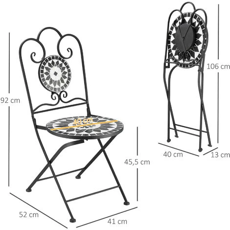 Optez pour ces jolies chaises pliantes en métal et mosaïque pour apporter du charme à votre extérieur. Affichant des teintes variées et colorées, cette chaise de jardin vendue par 2 pliante en séduira plus d’un. Pliante, les chaises en métal pourront ainsi être aisément stockées. Caractéristiques : – Chaises pliables pour faciliter le rangement et le transport – Style fer forgé en métal noir et mosaïque céramique motif rose des vents mêlant élégance et charme de la campagne – Structure robuste en métal époxy anticorrosion : matériau de qualité résistant aux rayons UV, à l’humidité et ne nécessitant pas d’entretien particulier – Assise pronde profonde, dossier ergonomique incliné : grand confort d’utilisation – Chaises de jardin mosaic parfaites pour le jardin, la terrasse, la cour et le balcon – Aucun assemblage requis – Recommandation : veuillez protéger vos chaises si inutilisation afin d’optimiser leur longévité Spécifications : – Couleurs principales : noir, blanc – Matériaux principaux : métal époxy, carreaux de céramique – Dim. chaises : 41l x 52P x 92H cm – Dim. pliées : 106L x 40l x 13H cm – Dim. assise : 40l x 40P x 45,5H cm – Dim. dossier : 41L x 45H cm – Charge max. recommandée : 120 Kg – Livraison effectuée en un colis – Réf. : 84B-873