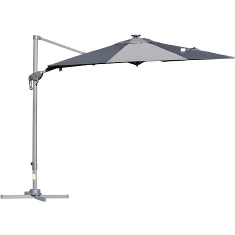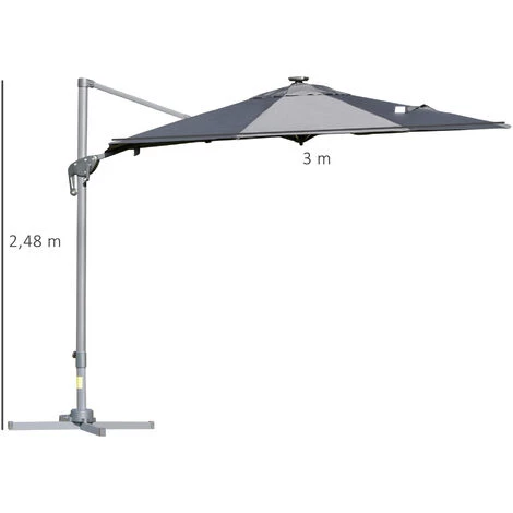 Ce superbe parasol déporté LED est idéal pour profiter entre amis ou en famille de votre extérieur même par forte chaleur ! À la fois pivotant à 360° et inclinable, vous pourrez le régler à votre guise suivant l’heure de la journée et la hauteur du soleil. Pratique et design, cet équipement indispensable de jardin et terrasse vous ravira ! Caractéristiques : – Parasol déporté octogonal grande taille dim. Ø 3 x 2,48H m – Parasol design LED alliant modernité et élégance, belle luminosité LED intégrée dans chaque entretoise et générée par capteur solaire 1,6 W (interrupteur inclus) – Idéal pour profiter d’une grande zone ombragée sur votre terrasse, dans votre jardin ou au bord de votre piscine ! – Possibilité d’incliner le parasol à 4 niveaux en fonction de la hauteur du soleil – Parasol pivotant à 360° (par action pédale) pour vous protéger du soleil toute la journée – Système d’ouverture et fermeture à manivelle en aluminium : pratique, rapide à ouvrir fermer à votre guise – Équipé de 8 entretoises + châssis robuste en aluminium et métal époxy anticorrosion : usage pérenne – Pied en croix : stabilité & sécurité optimums – Toile en polyester haute densité 180 g/m² : protection optimale contre les rayons UV nocifs du soleil – Note : parasol à installer uniquement sur un sol parfaitement plat et à lester (90 Kg min., dalles non fournies) – Recommandation d’usage : il est fortement conseillé de fermer & protéger votre parasol par mauvais temps (pluie, vent, etc…) Spécifications : – Couleur : gris – Matériaux principaux : aluminium, acier, polyester haute densité – Dim. totales : Ø 3 x 2,48H m – Dim. mât : 6,8L x 5l cm – Dim. entretoises : 1,3L x 2 cm – Dim. base de parasol : 100L x 100l x 6H cm – Dim. panneau solaire : 12,3L x 12,3l cm – Puissance : 1,2 W – Tension : 3,7 V – 3 piles AA rechargeables : 2000 mAh / 1,2 V – Certifications normes : CE-EMC, RoHS, MSDS – Livraison effectuée en un colis – Réf. : 84D-110CG