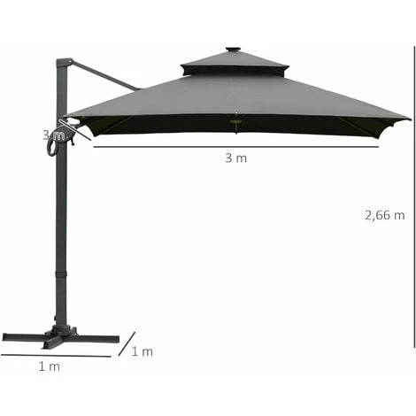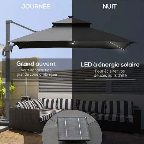 Ce superbe parasol déporté LED est idéal pour profiter entre amis ou en famille de votre extérieur même par forte chaleur ! Inclinable, pivotant à 360°, vous pourrez le régler à votre guise suivant l’heure de la journée et la hauteur du soleil. Pratique et design, cet équipement indispensable de jardin et terrasse vous ravira !