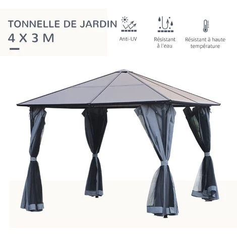 Outsunny Pavillon De Jardin Tonnelle Rigide Dim. 4L X 3l X 2,65H M 4 Parois Latérales Anti-UV Gris 4 Moustiquaires Zippées Alu. Métal Polycarbonate Noir Brun