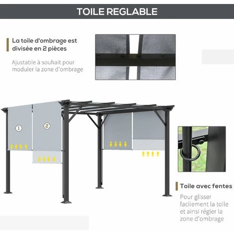 Cette superbe pergola Ă double toile rĂ©tractable vous permettra de passer d’agrĂ©ables moments Ă l’extĂ©rieur tout en Ă©tant protĂ©gĂ© du soleil ou au contraire tout en Ă©tant exposĂ© totalement ou partiellement Ă votre guise. C’est la pergola indispensable pour profiter au maximum de l’Ă©tĂ© ! CaractĂ©ristiques : – Pergola de style contemporain bicolore très Ă©lĂ©gant afin de sublimer votre terrasse et extĂ©rieur – Pergola idĂ©ale pour se construire une surface ombragĂ©e Ă l’extĂ©rieur afin d’installer un salon de jardin, un ensemble Ă diner de jardin, un barbecue, etc. – Double toile de toit coulissante en polyester haute densitĂ© (revĂŞtement PU anti-UV) avec pans latĂ©raux, pratique pour se protĂ©ger du soleil Ă toute heure de la journĂ©e – Double toit rĂ©tractable très facilement manuellement en le faisant coulisser dans son rail – Structure en mĂ©tal Ă©poxy anticorrosion robuste : durĂ©e de vie pĂ©renne – Excellent niveau de finition : poteaux ornĂ©s de chapiteaux supports du toit avec piètement de mĂŞme forme: soliditĂ© et Ă©lĂ©gance au rendez-vous – Installation facile Ă l’aide du manuel d’assemblage illustrĂ© fourni SpĂ©cifications : – 2 coloris au choix : beige, noir ou gris, noir – MatĂ©riaux principaux : mĂ©tal Ă©poxy anticorrosion et tissu de polyester – Dimensions totales : 3,05L x 3,05l x 2,2H m – Espacement des poteaux : 2,62 m – Dim. châssis tubulaire : 8L x 8l cm – Dim. base piètement : 18L x 18l cm – Livraison effectuĂ©e en 2 colis – RĂ©f : 84C-242BN/GY