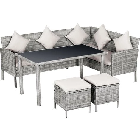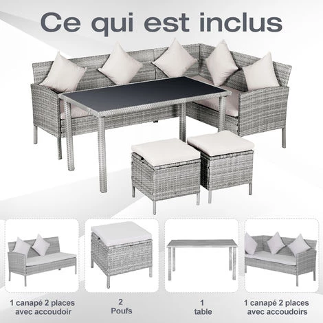 Aimez-vous vivre la nature ? Souhaitez-vous un grand salon de jardin d’angle en réponse à votre goût pour l’élégance et la modernité ? Êtes-vous lassé de votre canapé en cuir ? Alors optez pour ce magnifique ensemble salon de jardin 6 personnes qui sublimera votre extérieur. De quoi confortablement installer et épater votre famille et amis ! Caractéristiques : – Ensemble salon de jardin complet doté d’un total de 5 pièces : 2 canapés 2 places, 1 grande table à manger et 2 poufs repose-pieds – Style cosy chic en résine tressée gris clair avec coussins beige clair mêlant élégance, fraicheur et sobriété – S’intègre parfaitement à tout type d’extérieur : terrasse, jardin, patio, véranda, etc… – Ensemble des coussins fournis garnissage mousse haute densité grand confort : 4 coussins d’assise + 5 coussins de dossier – Revêtement doublé en polyester imperméabilisé de chaque coussin : rembourrage mousse préservé de l’humidité pour un séchage rapide – Revêtement salon en résine tressée imitation rotin : matériaux de qualité résistant aux rayons UV, à l’humidité et ne nécessitant pas d’entretien particulier – Structure robuste en métal époxy anticorrosion pour un usage pérenne – Grand plateau de table à manger en verre trempé Spécifications : – Couleurs principales : gris, beige – Matériaux principaux : fer galvanisé, résine tressée imitation rotin, verre trempé – Dim. canapés 2 places avec accoudoir : 134l x 60P x 75H cm – Dim. canapé 2 places avec accoudoirs : 142l x 60P x 75H cm – Dim. table : 125L x 70l x 65H cm – Dim. poufs : 38L x 38l x 35H cm – Hauteur dossier : 35 cm – Hauteur accoudoirs : 58 cm – Dim. coussins dossier : 40L x 40l cm – Charge max. reco. par place : 160 Kg – Livraison effectuée en 2 colis – Réf. : 860-093CW