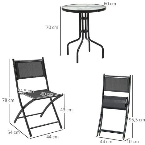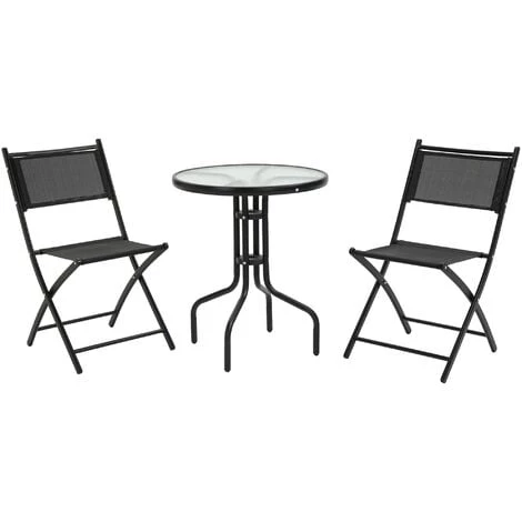 Ce splendide ensemble bistro composé d’une table ronde accompagnée de 2 chaises pliables sublimera votre extérieur (balcon, terrasse, jardin). Son style contemporain mélant métal, textilène noir avec plateau de table verre trempé sera votre nouvel atout charme et repos. Robuste, léger et facile à ranger, ce salon de jardin pliant s’adaptera à tous vos espaces. Caractéristiques : – Ensemble salon de jardin bistro 2 personnes doté d’un total de 3 pièces : 2 chaises, 1 table ronde – Style contemporain mélant métal, textilène noir avec plateau de table verre trempé – Chaises pliables : rangement, déplacement pratique et facile si besoin – Plateau de table en verre trempé 5 mm – Structure robuste en métal époxy anticorrosion, assise et dossier en textilène haute densité 520 g/m² : matériaux de qualité résistant et ne nécessitant pas d’entretien particulier – Piètements antidérapants : stabilité optimum, aucun risque de rayure – Table ronde compacte Ø60 x 70H cm facile à déplacer et à installer même dans les espaces restreints type balcon – Idéal pour une installation aussi bien extérieure (jardin, terrasse, balcon) qu’intérieure (véranda) – Montage simple et rapide à l’aide du manuel d’assemblage illustré fourni – NB : recommandé de protéger votre ensemble de jardin durant les mois d’hiver ou en cas de longue inutilisation Spécifications : – Couleur : noir – Matériaux : métal thermolaqué – Dim. table : Ø60 x 70H cm – Dim. chaises : 54L x 44l x 78H cm – Dim. chaises pliées : 95,5L x 44l cm (ép. : 10 cm) – Dim. assise : 40L x 34,5l x 43H cm – Dim. dossier : 43,5L x 24H cm – Épaisseur verre trempé : 5 mm – Charge max. recommandée : 70 Kg (table), 114 Kg (chaises) – Livraison effectuée en un colis – Réf. : 84B-691