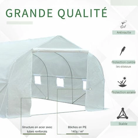 Cette grande serre tunnel de jardin vous aidera à protéger vos plantes contre la pluie, le vent, les dégâts causés par les oiseaux et les rayons intenses du soleil. Ses matériaux de haute qualité assurent cette protection à long terme.