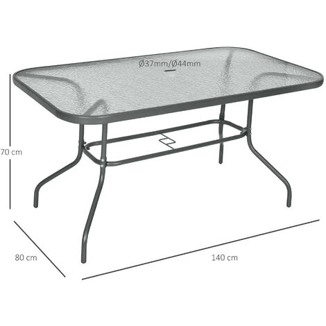 Apportez une touche d’élégance à votre intérieur ou extérieur avec cette superbe table rectangulaire. En métal époxy anticorrosion gris avec plateau verre trempé, cette table s’intégrera dans tous les environnements. Sa grande taille vous permettra de manger confortablement à 6 ou 8 personnes suivant modèle choisi. Son espace d’insertion parasol sera idéal pour manger à l’ombre. Caractéristiques : – Table de jardin rectangulaire dim. 120L X 80l x 70H cm très élégante afin de s’intégrer dans tous les environnements : extérieur type terrasse, balcon, jardin ou intérieur (véranda) – Table rectangulaire grande taille, table à manger qui vous permettra de manger confortablement à 6 ou 8 personnes suivant modèle choisi – Espace pour installer votre parasol (convient aux parasols à mât Ø compris entre 3,7 cm et 4,4 cm) – Fabriquée à partir de métal époxy anticorrosion avec plateau verre trempé : usage pérenne – Pieds équipés de patins antidérapants : stabilité optimale, aucun risque de rayure de votre sol – Entretien simple à l’aide d’un simple chiffon légèrement humide – Fourni avec un manuel d’assemblage illustré : montage facile et rapide Spécifications : – Couleur principale : gris – Matériaux principaux : métal époxy, verre trempé – 2 dim. totales au choix : 120L x 80l x 70H cm ou 140L x 80l x 70H cm – Convient aux parasols à mât Ø compris entre 3,7 cm et 4,4 cm – Espacement entre les pieds : 62 cm, 101 cm ou 62 cm, 121 cm suivant modèle choisi – Charge max. recommandée : 70 Kg – Livraison effectuée en un colis – Réf. : 84B-376V01/376