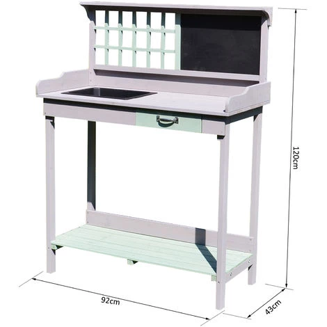 Cette magnifique table de rempotage jardinage en bois massif de pin pré-huilé et peint en gris et vert menthe vous permettra de profiter d’un confortable espace de plantation pour vos fleurs, légumes, herbes aromatiques, semis, etc… Grâce à son double niveau (étagère inférieur, plan de travail) et à ses nombreux équipements (tiroir, évier etc…), jardiner et rempoter deviendra que plus facile, pratique et agréable ! Caractéristiques : -Idéal pour le rempotage de vos fleurs, herbes aromatiques, légumes ou préparation de vos semis -Double niveau de rangement : plateau principal/plan de travail et étagère sous-jacente -Coloris moderne gris et vert menthe pour une parfaite Intégration sur votre balcon, terrasse ou dans votre jardin -Fabrication en bois de pin robuste pré-huilé et peint pour une durabilité optimisée – Tiroir et évier, pratique pour travailler en toute efficacité -Installation simple et rapide (manuel d’assemblage illustré fourni) -Convient à une installation en extérieur ou en intérieur Spécifications : -Couleurs : gris, vert menthe -Matériau principal : bois massif de pin pré-huilé et peint -Dim. totales : 92L x 43l x 120H cm -Hauteur du plateau/plan de travail : 82 cm -Dim. tiroir : 28L x 30l x 7,7H cm -Charge max. recommandée : 20 Kg -Livraison effectuée en un colis -Réf. : B41-006
