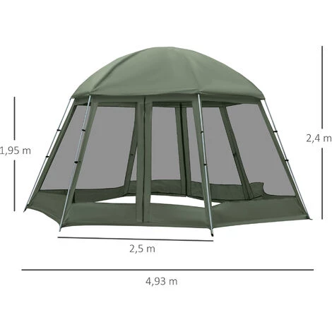 Cette magnifique tente de camping familiale vous offrira en un rien de temps un bel espace pour camper confortablement ! Sa hauteur de 240 cm vous permettra de vous tenir debout en tout confort, quoi de mieux pour passer des vacances inoubliables ! Caractéristiques : – Grande tente de camping familiale très facile à installer et à ranger – Tente de camping familiale dim. 493L x 493l x 240H cm pouvant accueillir jusqu’à 8 personnes max. – 6 parois latérales en maille avec 2 entrées offrent une circulation d’air et une visibilité optimale – Tissu en taffetas durable avec revêtement en PU argenté convient pour une protection UV accrue – Le cadre en fibre de verre rend la tente en forme d’hexagone, solide et stable – Un sac de transport est inclus pour faciliter le transport et le stockage – Equipée de 4 cordes et 8 piquets de sol pour plus de stabilité – Convient pour le camping, trekking, etc. Spécifications : – Couleur : vert foncé – Matériaux principaux : taffetas en polyester, polyester, fibre de verre, acier – Dimensions totales : 493L x 493l x 240H cm – Dim. entrée : 250L x 176H cm – Capacité : 6-8 personnes – Livraison effectuée en un colis – Réf. : A20-222DG