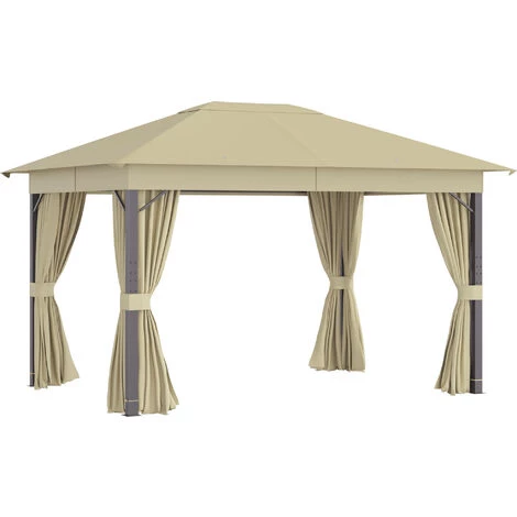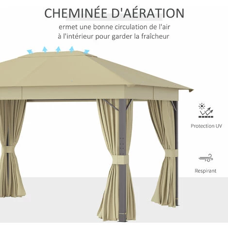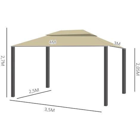 Cette magnifique tonnelle de jardin élégante et moderne pourrait vous offrir de l’ombre ou vous le souhaitez ! C’est est un barnum de jardin design et pratique idéal pour toute la famille ! Équipé d’un toit double et de 4 parois latérales, vous et vos invités seront parfaitement protégés contre le soleil et contre les insectes tout en profitant d’un air respirable et agréable. Caractéristiques : – Pavillon de jardin avec évent avec fonction de ventilation en cas de forte chaleur – Idéal pour organiser une fête, un pique-nique, un anniversaire, etc. – Protège efficacement contre les rayons UV du soleil – Armature en métal pour plus de solidité et de stabilité – Les rideaux créent de l’intimité lorsque vous le souhaitez, attachés avec des sangles auto-agrippantes – Équipé de 8 clous de sol pour plus de stabilité -Assemblage requis – Recommandation : il est conseillé d’enlever la toile de toit et les rideaux latéraux par mauvais temps (vent fort, pluie forte, neige, etc…) pour prolonger la durée de vie du produit – Spécifications : – Couleur : beige – Matériaux principaux : métal époxy anticorrosion, polyester – Dimensions totales : 4L x 3l x 2,7H m – Hauteur avant-toit : 2,05 m – Espacement des colonnes : 3,5L x 2,5l m – Livraison effectuée en un colis – Réf. : 84C-321