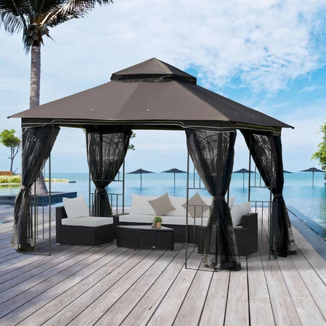 Outsunny Tonnelle Barnum Style Colonial Double Toit Toile Moustiquaires Amovibles 4 étagères D’angle Métal époxy Polyester Chocolat
