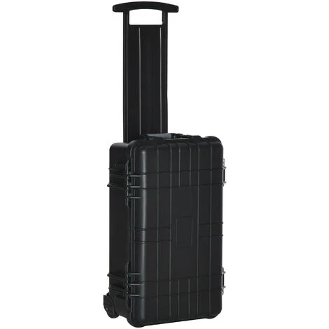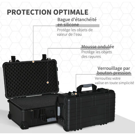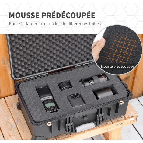 Cette mallette d’extérieur antichoc pour appareil photo avec mousse prédécoupée, poignée telescopique et roulettes est idéale pour transporter des objets sensibles tels que des objectifs, des appareils photo, des instruments de mesure, etc.