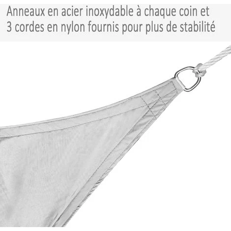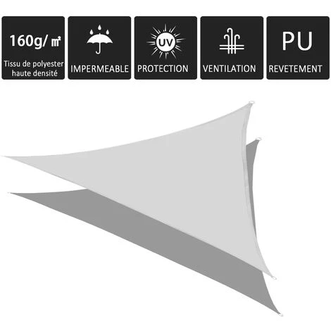 Ce superbe voile d’ombrage triangulaire grande taille dim. 3 x 3 x 3 m en polyester imperméabilisé haute densité 160 g/m² vous permettra de vous constituer une grande zone protégée des rayons UV du soleil et de la pluie. C’est l’équipement indispensable à installer sur votre terrasse, dans votre jardin, ou à emporter au camping, pique-nique ou trekking !